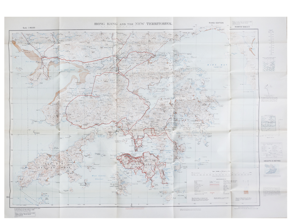 DETAIL: Attractive large sized third edition 1950's map of the Hong Kong, Kowloon and the New Territories. The map was originally published in 1936 by the British War Office and the 1952 print was a limited run of 6,000 copies.