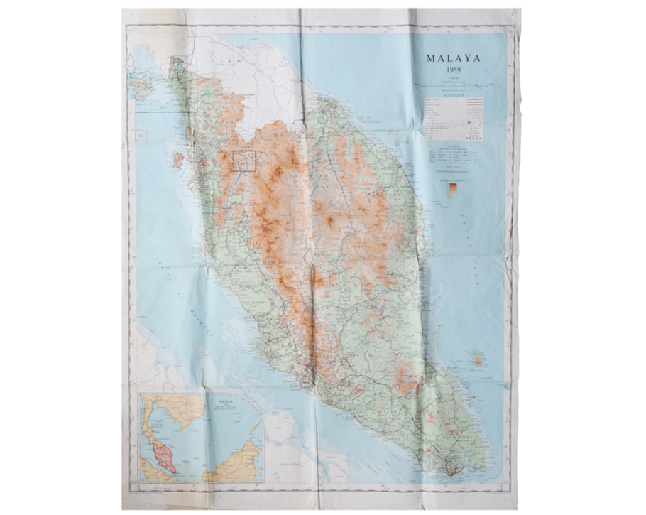 DETAIL: Large sized vintage original map of Malaya and Adjacent Territories, backed onto linen by the survey department of the Federation of Malaya shortly before independence in 1963