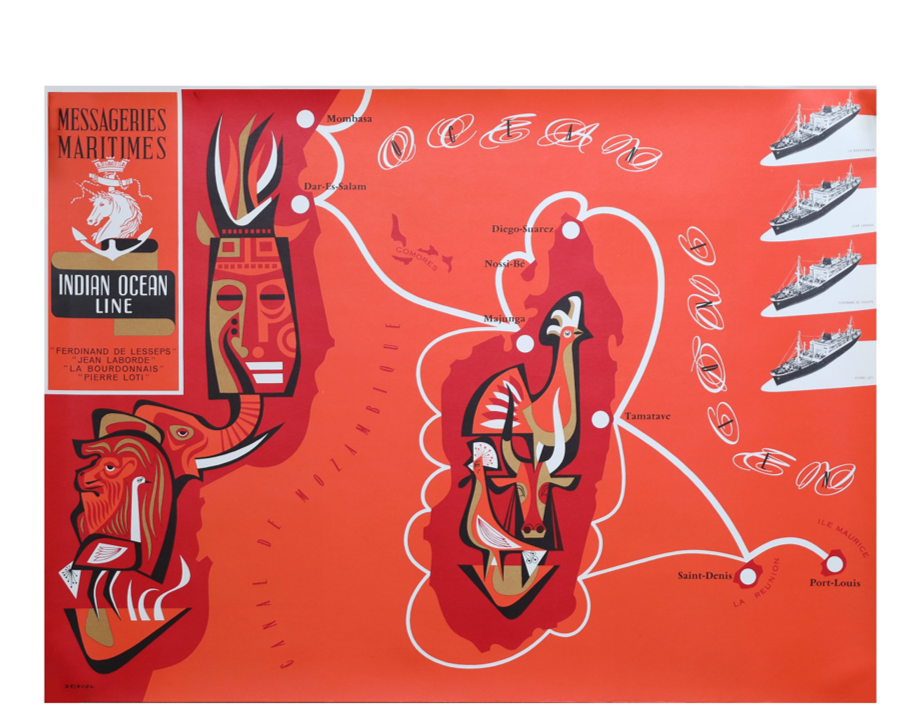 DETAIL: Original poster: “Messageries Maritimes. Indian Ocean Line. Ferdinand de Lesseps – Jean Laborde – La Bourdonnais – Pierre Loti”, created by Desruol. Printed by the Compagnie des Messageries Maritimes. Verso details the facilities on board